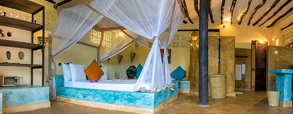 Located in a bungalow surrounded by a lush garden, this room comes with a balcony or veranda with Ocean front view, Zanzibari-style décor, king size bed with mosquito net, desk, stone bench, safe, fans, wardrobe. The private bathroom is equipped with a shower.
